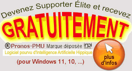 1er CADEAU AUX SUPPORTERS ÉLITE:Le logiciel Pronos-PMU pourvu d'Intelligence Artificielle HippiqueAvec ce logiciel (pour Windows 10,11 ...) vous pourrez classer les stratégies de jeu en les classant suivant les critères de votre choix, et ainsi choisir l'écart maximum, le rendement minimum, la durée des tests, etc...  Il vous permettra aussi de trouver des stratégies en Champs Réduits permettant ainsi de jouer beaucoup de chevaux sans pour autant trop dépenser en mises.  |